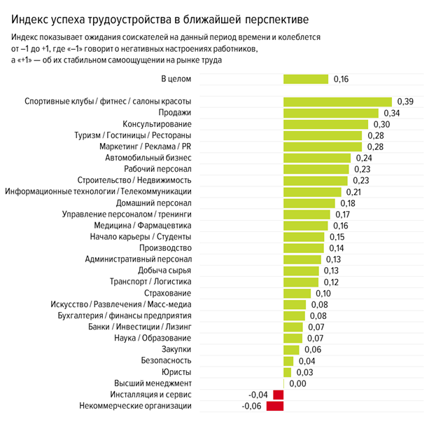 Больше всего оптимистов среди сотрудников сферы продаж, спорта и салонов красоты, меньше всего - у представителей сферы НКО, инсталляции и сервиса.