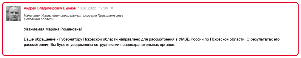 Напомним, 11 июля на сайте губернатора Псковской областистало появилось обращение, что псковские волонтёры Владимир Минушкин и Артём Матвеев не выходят на связь после передачи гуманитарной помощи в Харьковской области. Супруга Минушкина обратилась к Михаилу Ведерникову с просьбой помочь ей вернуть мужа домой.