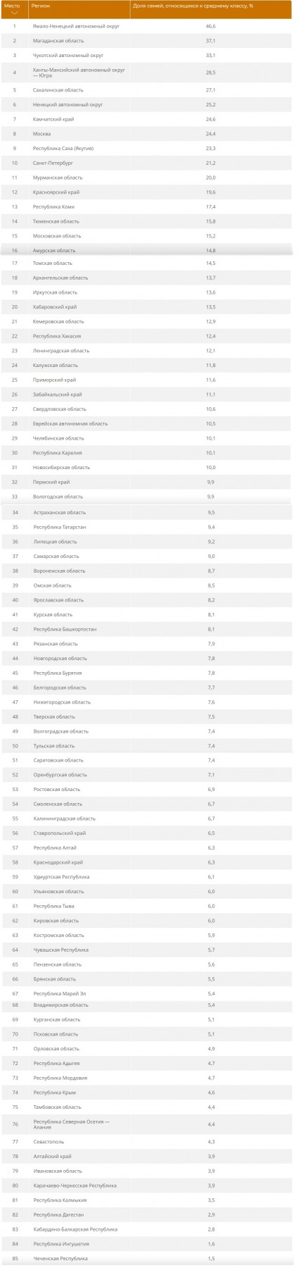 Лидером рейтинга стал Ямало-Ненецкий АО: 46,6 процента населения относятся к среднему классу. На втором месте - Магаданская область (37,1 процента), на третьем - Чукотский автономный округ (33,1 процента).