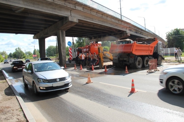 Сейчас на объездной под виадуком движение транспорта ограничено по двум полосам.