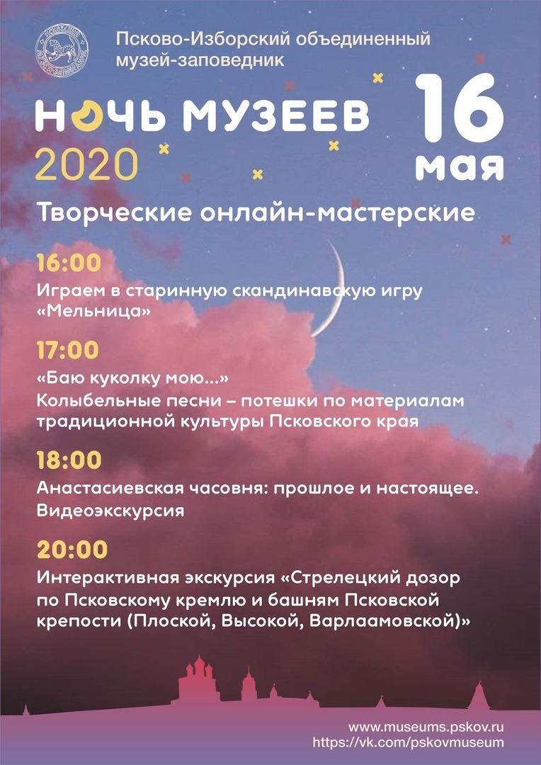 «Ночь музеев» в Псковской области пройдёт в формате онлайн: Псково-Изборский объединённый музей-заповедник приглашает всех желающих присоединиться к акции уже в эту субботу, 16 мая.