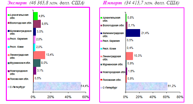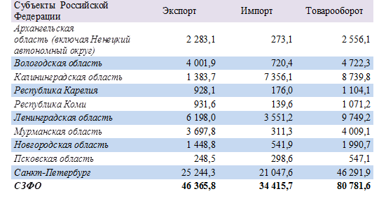 В относительных данных доля Псковской области в структуре экспорта Северо-Западного федерального округа составляет 0,5 процента. Лидером по экспорту по итогам 11 месяцев года стал Петербург, его доля составляет 54,4 процента, на втором и третьем местах - Ленинградская и Вологодская области.