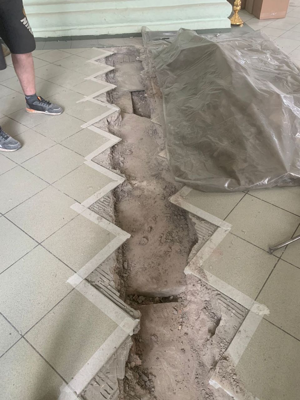 Обнаружено, что под керамо-гранитной плиткой, уложенной, предположительно, в 90-е годы XX столетия, находятся известняковые плиты.