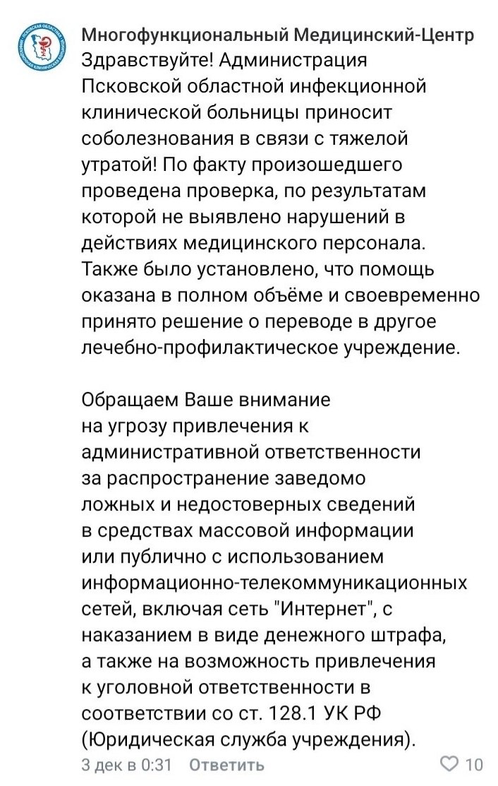Родственникам скончавшегося в Пскове ребёнка администрация областной инфекционной больницы пригрозила ответственностью за распространение «фейков»: комментарий администрации Псковской областной инфекционной больницы опубликован в группе «Жесть по-псковски» соцсети «ВКонтакте».