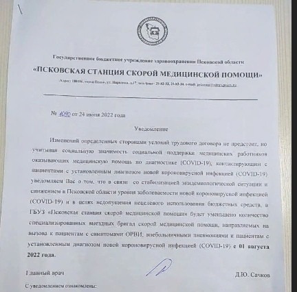 С 1 августа Псковская станция скорой медицинской помощи уменьшает количество специализированных ковид-бригад: такое уведомление, подписанное главврачом Денисом Сачковым, получили сотрудники медицинского учреждения.