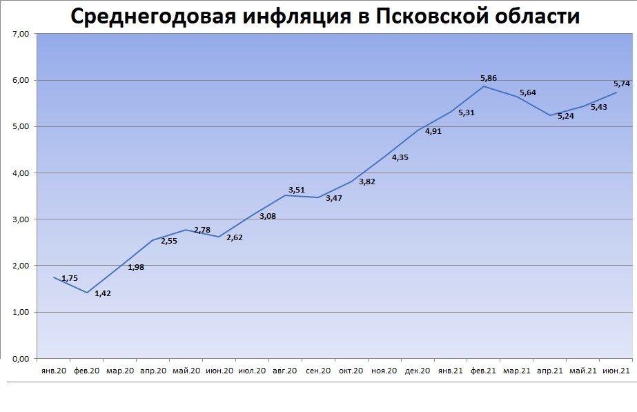 Среднегодовая инфляция в Псковской области по итогам июня выросла на 0,3 и составила 5,74 процента: об этом сообщает Центробанк России.
