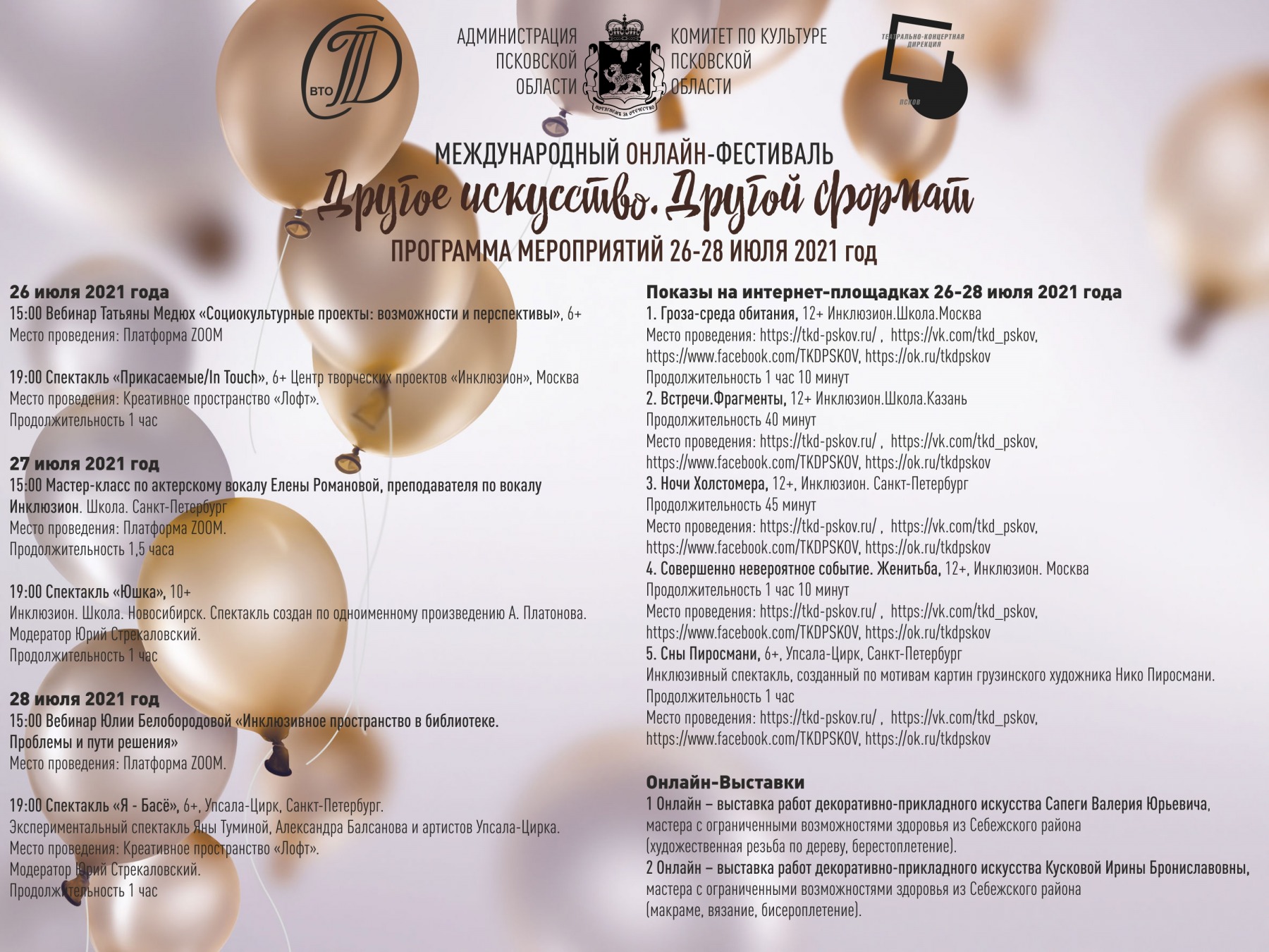 Онлайн-фестиваль «Другое искусство. Другой формат» пройдёт в Псковской области с 26 по 28 июля. Основными площадками его проведения станут креативное пространство «Лофт», Бобровский детский дом-интернат, Производственно-интеграционные мастерские для инвалидов, Молодёжный лагерь «Самолва», сайт Театрально-концертной дирекции и социальные сети ТКД.