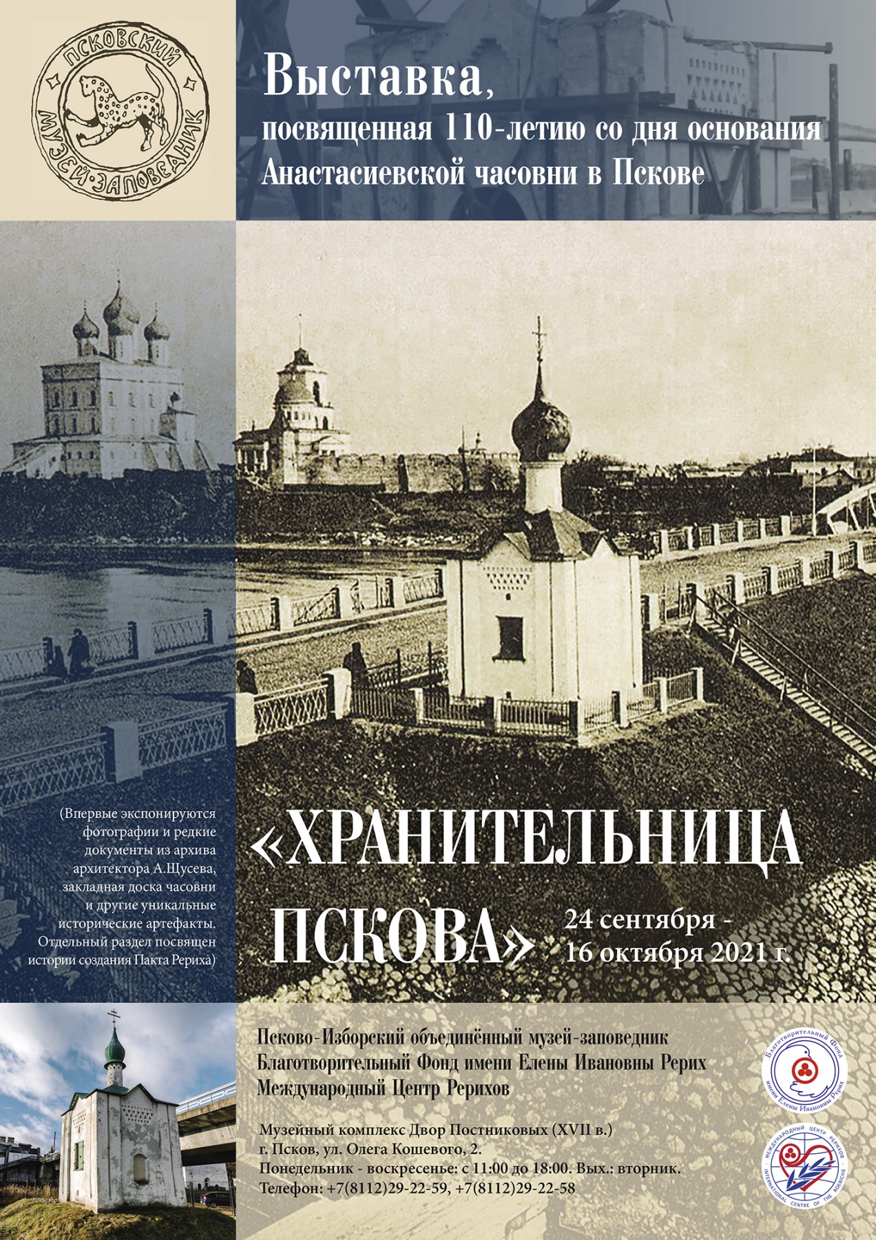 24 сентября во Дворе Постникова в Пскове откроется выставка «Хранительница Пскова», посвящённая 110-летию со дня основания Анастасиевской часовни: как сообщили в Псково-Изборском объединённом музее, экспозиция, создателями который стал музей, Благотворительный Фонд имени Елены Ивановны Рерих (Москва), Международный Центр Рерихов (Москва), будет доступна для посещения до 16 октября по адресу: ул. Олега Кошевого, 2.