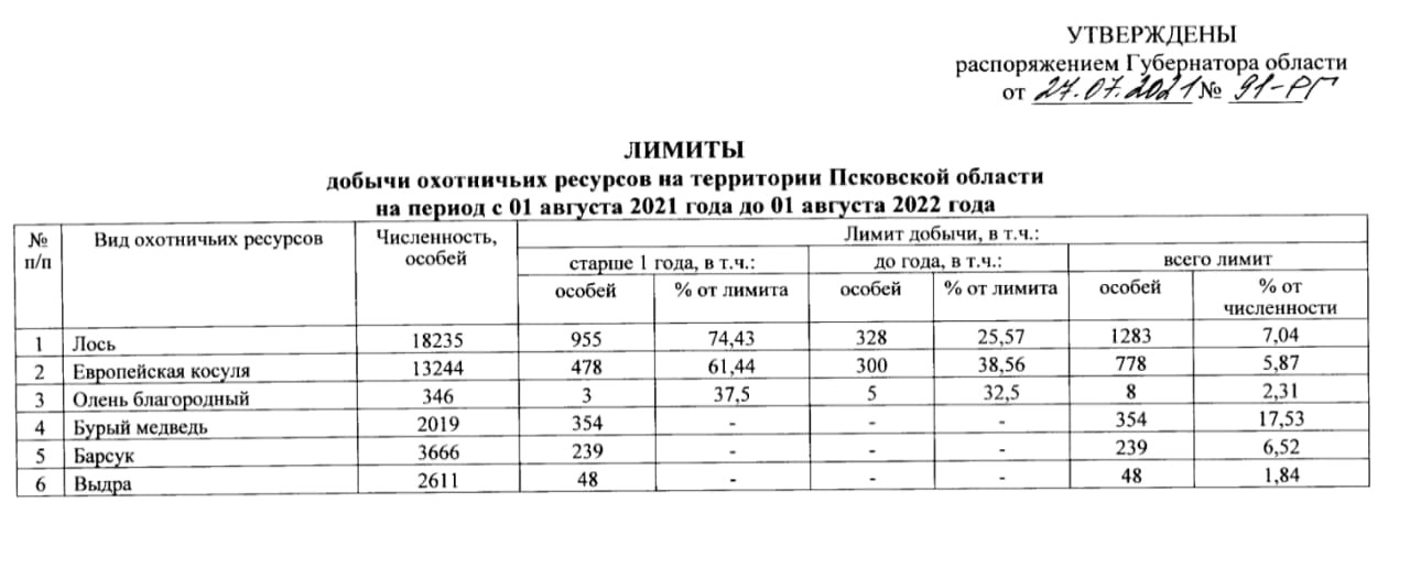 Губернатор Псковской области Михаил Ведерников утвердил лимиты добычи охотничьих ресурсов на ближайший год: соответствующее распоряжение опубликовано на сайте комитета про природным ресурсам администрации Псковской области. Лимиты распределены на лося, европейскую косулю, оленя благородного, медведя, барсука и выдру.