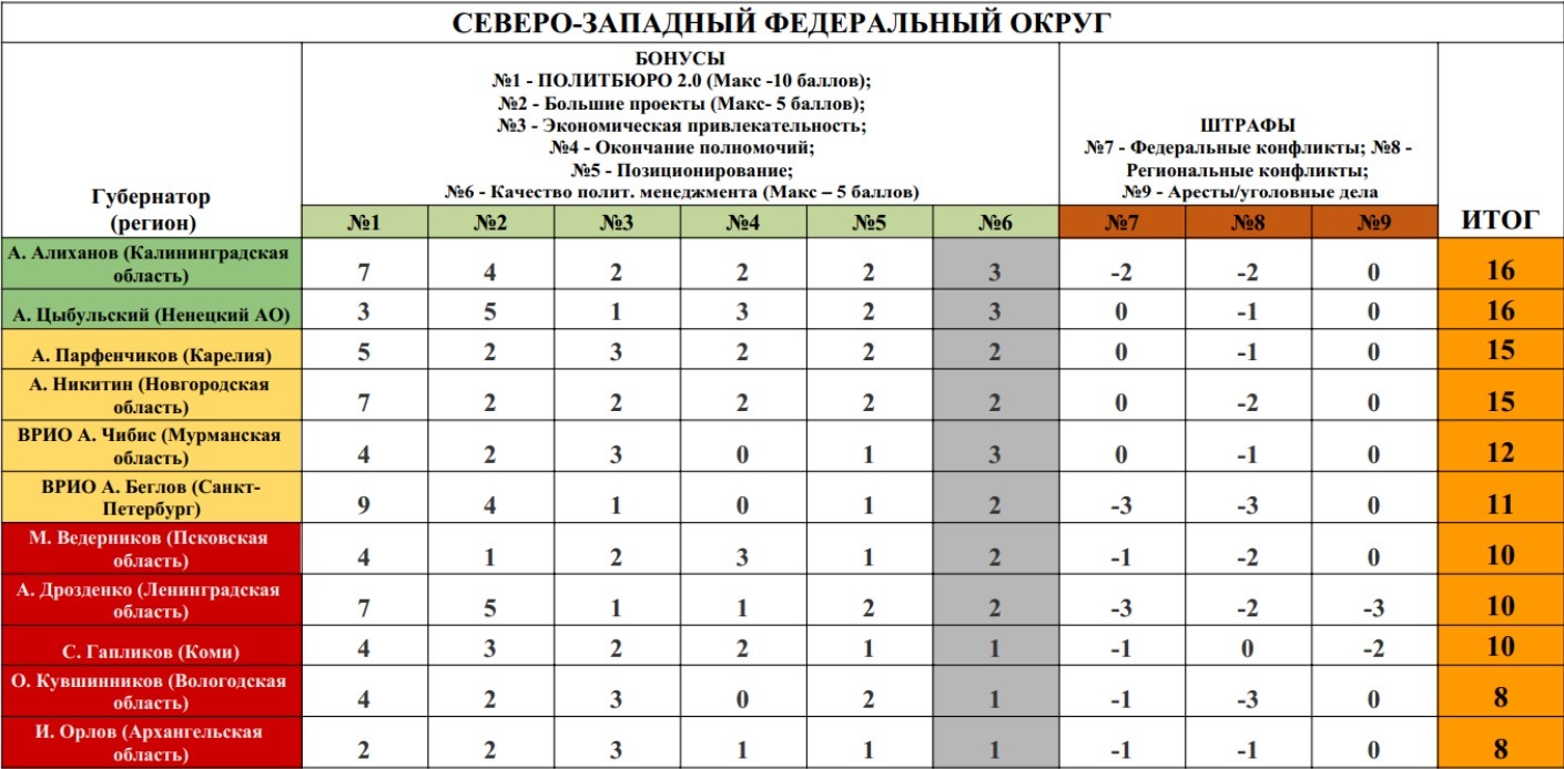 Как отмечают авторы рейтинга, формирование трёх групп риска внутри губернаторского корпуса обозначает возможные степени отставки: зелёной (16 и более баллов - отставка маловероятна), жёлтой (15 и менее баллов - есть риск отставки) и красной (10 и менее баллов - высокая вероятность отставки).