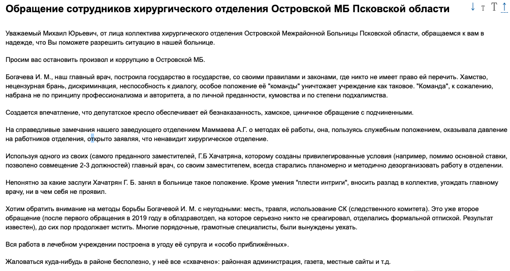 Напомним, в том письме бывший заведующий хирургическим отделением больницы Алил Маммаев просит «остановить произвол и коррупцию в Островской межрайонной больнице» и обвиняет во всё главврача Ирину Богачёву.