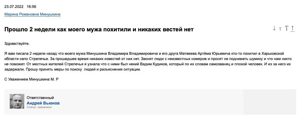 «Я вам писала две недели назад, что моего мужа Минушкина Владимира Владимировича и его друга Матвеева Артёма Юрьевича кто-то похитил в Харьковской области в селе Стрелечье. За прошедшее время никаких известей от них нет. Звонят люди с неизвестных номеров и просят не поднимать шумиху, говорят, что нам никто не поможет», - пишет Марина Минушкина.