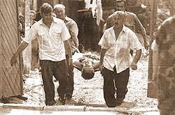 Выносить детей хотели все. Воя сиреной, приехали две скорые. Носилки выносили бегом, раненых грузили в скорые и отправляли. Когда в одной машине не оказалось места, раненых женщин усадили, а на носилки уложили семилетнюю девочку. Еще одну девочку того же возраста вынес молодой парень на руках. Она вся была желтого цвета, в кровоподтеках. Девочку бережно уложили прямо на газон. "Почему ее не везете в больницу?" - закричала какая-то женщина. Парень, вытирая ладонями глаза, посмотрел на нас и ничего не сказал. Женщина села на корточки перед девочкой и приложила ладонь к шее. "У нее нет пульса",- в ужасе прошептала она, приподняла безжизненное тело и прижала к себе. Сразу несколько человек вскрикнули - на спине у ребенка была багровая рваная рана. Потом на газон положили тело мальчика лет десяти, завернутое в простыню. По очертаниям было видно, что у ребенка нет ноги. Мужчины подходили, поднимали простыню и смотрели на изуродованное детское лицо. Плакали. Сюда же положили два женских тела. Под простынями, которые упорно поднимали все, кто тут стоял, были восковые лица с синими губами. Сквозь белую ткань быстро проступали алые пятна. Скоро на газоне было шесть укрытых простынями тел. Люди стояли над ними, но смотрели уже не на них, а туда, откуда выносили живых. Носилки с ранеными грузили в машины. На смену уезжающим машинам прибывали новые: легковые, скорые, военные "таблетки" и "уазики".